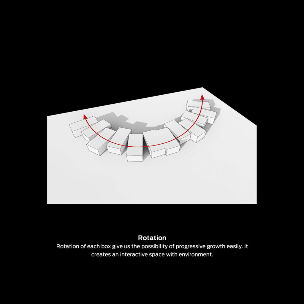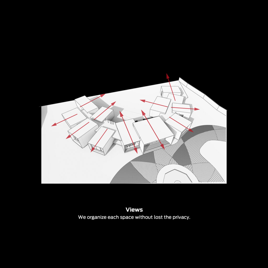 To meet these demands, we designed the home as a series of modular units, or “boxes,” arranged in a circular layout. This configuration allows each module to be added according to the client’s timeline and needs. The orientation of each box is carefully considered to maximize views and ensure visual privacy between the social areas, resting spaces, and guest rooms.